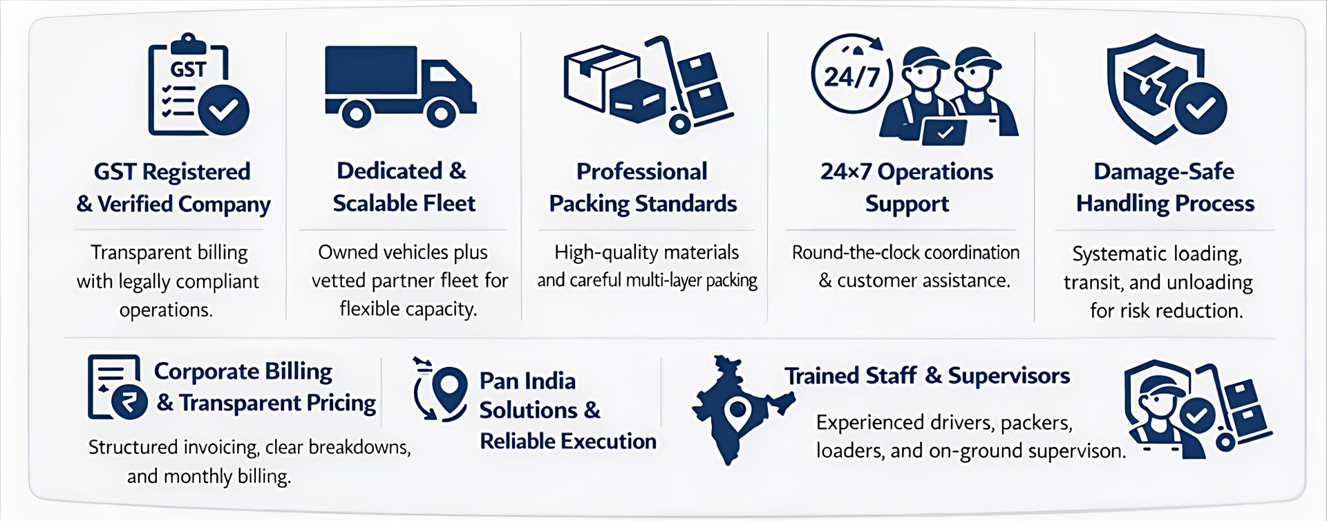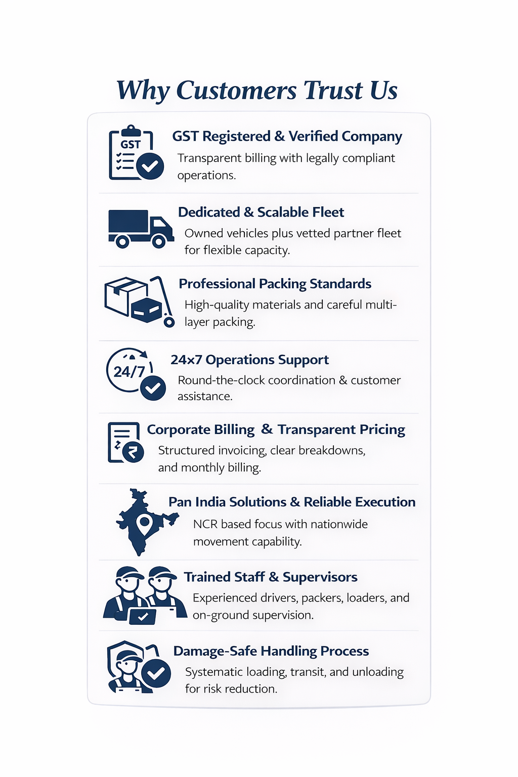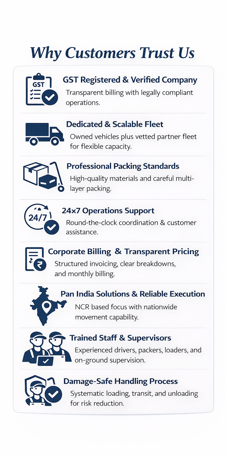 🛡️GST Registered I🚛Dedicated Vehicles I⏱️Same-Day NCR Delivery I📄Transparent Pricing I🔗Pan-India Relocation